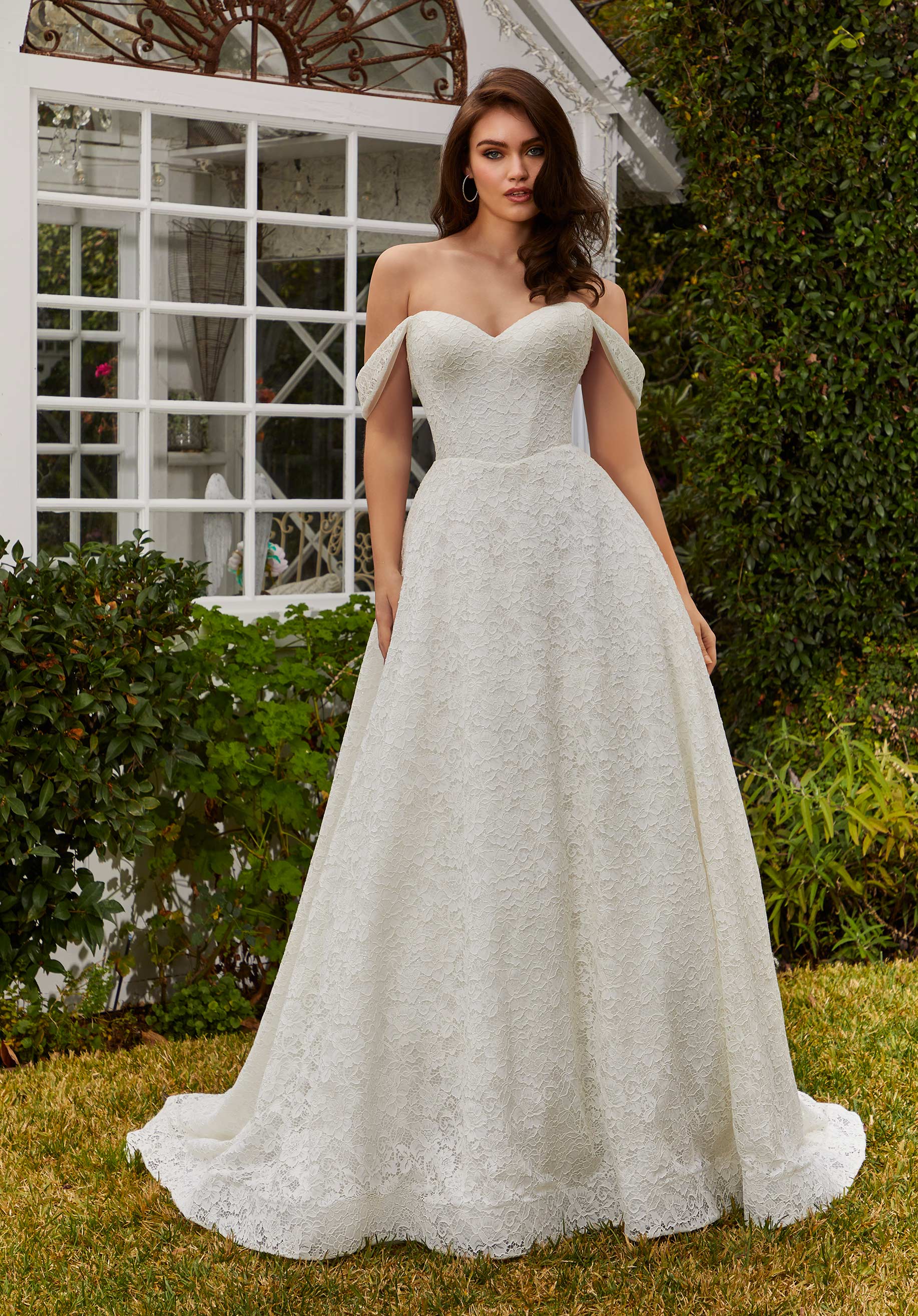 Dainty and delicate, our River designer wedding dress stuns in allover Alençon lace that has an intricate floral motif. Classic details like the strapless sweetheart neckline and soft basque waist make the dress easy to love, but out favorite back is the sheer back framed by the romantic lace with corset boning. Sparkle tulle fabric ensures you'll shimmer all night long, while detachable off-the-shoulder sleeves let you switch up your look. Shown in Ivory/Honey and Ivory/Bluebell/Honey.