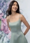 This satin A-line bridesmaid dress features a soft scoop neckline and delicate thin straps for a clean, effortless look. Contoured bodice seams sculpt the silhouette, while a lace-up corset back adds a romantic, customizable finish. Perfect for bridesmaids who love classic style with contemporary detailing.