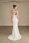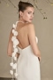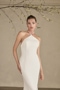Think Lake Como destination wedding in style LE157 Tahlena. This fit-and-flare gown is her own inspiration, complete with the most flattering halter neckline tied with 3D taffeta flowers that trickle down the bride's back. Her structured bodice is crafted from 12-point boning which creates a snatched silhouette before flaring out at mid-thigh. This clean, contemporary gown allows for freedom and ease of movement. Stretch chiffon and matte satin flow effortlessly into 59-inch train. Tahlena is perfect for a minimalist bride who's after an elegant, clean-lined look. The high halter neck and languid floral ties call for a polished updo.