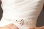 Organza Available in white, ivory or champagne Sizes 00 to 30 Shirring on bodice Belt at waist embellished with rhinestones, sequins, beads and crystals Bias cut flange skirt Includes shawl and detachable shoulder straps