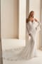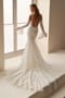 This gorgeously romantic fit and flare gown is crafted from opulent allover Venise lace. A stunning semi-sheer illusion back with floral lace detailing and delicate covered buttons make this wedding gown truly one-of-a-kind. Separate long lace bell sleeves add a unique style statement.