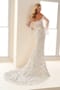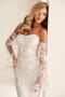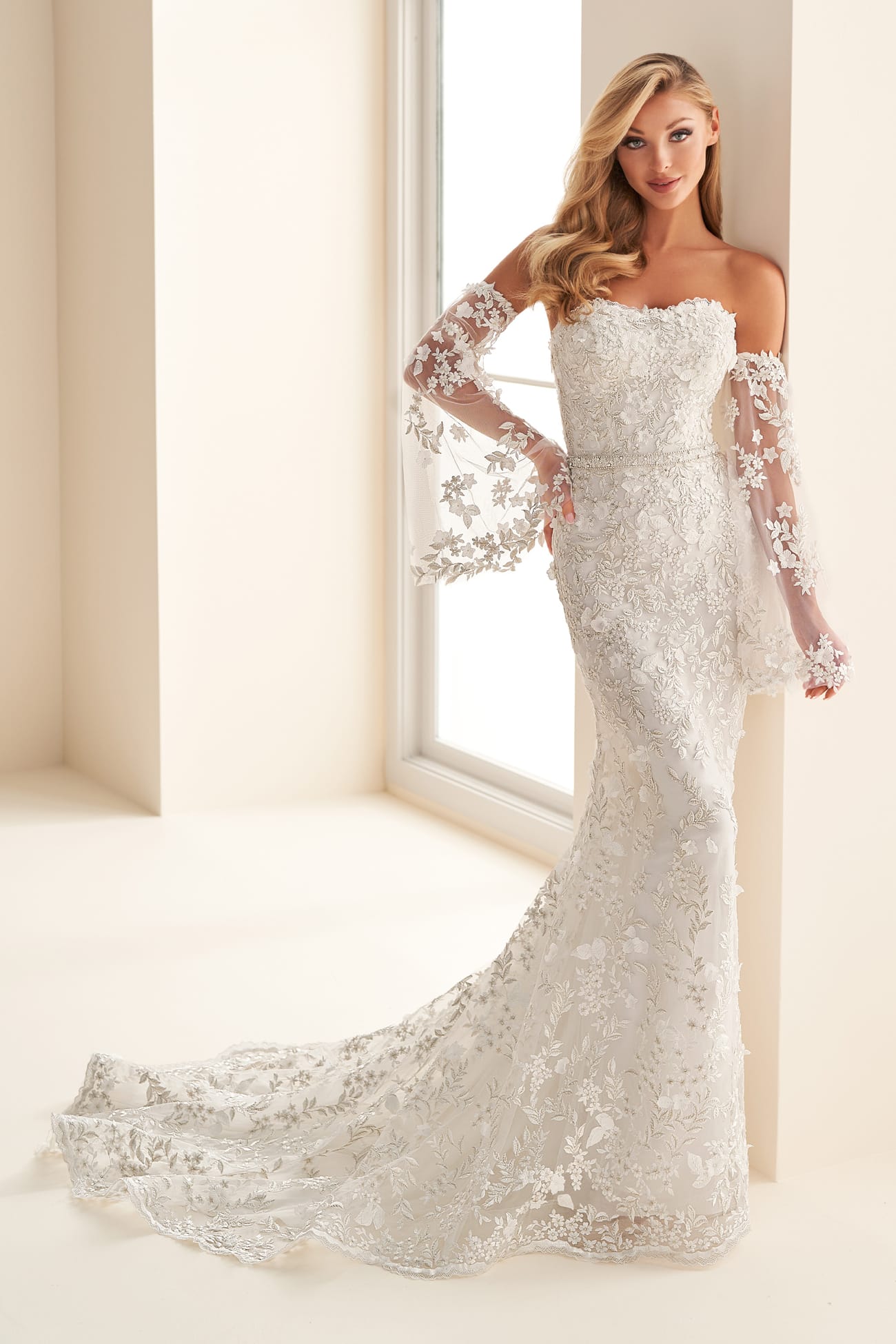 Say "I do" in this beautifully organic fit and flare gown. Featuring a softly structured bodice with a sultry semi-sheer back and gorgeous 3D metallic floral detailing, this wedding gown is sure to make a statement. Separate long bishop sleeves add an element of dreamy romance.