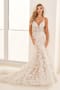 Crafted from dreamy tulle and opulent Schiffli lace applique, this one-of-a-kind fit and flare gown is simply spectacular. Featuring a seductive deep plunge sweetheart neckline that accentuates your decolletage, this bridal look is the perfect combination of timeless elegance and allure. A semi-sheer chapel train makes a stunning statement that will leave guests in awe.