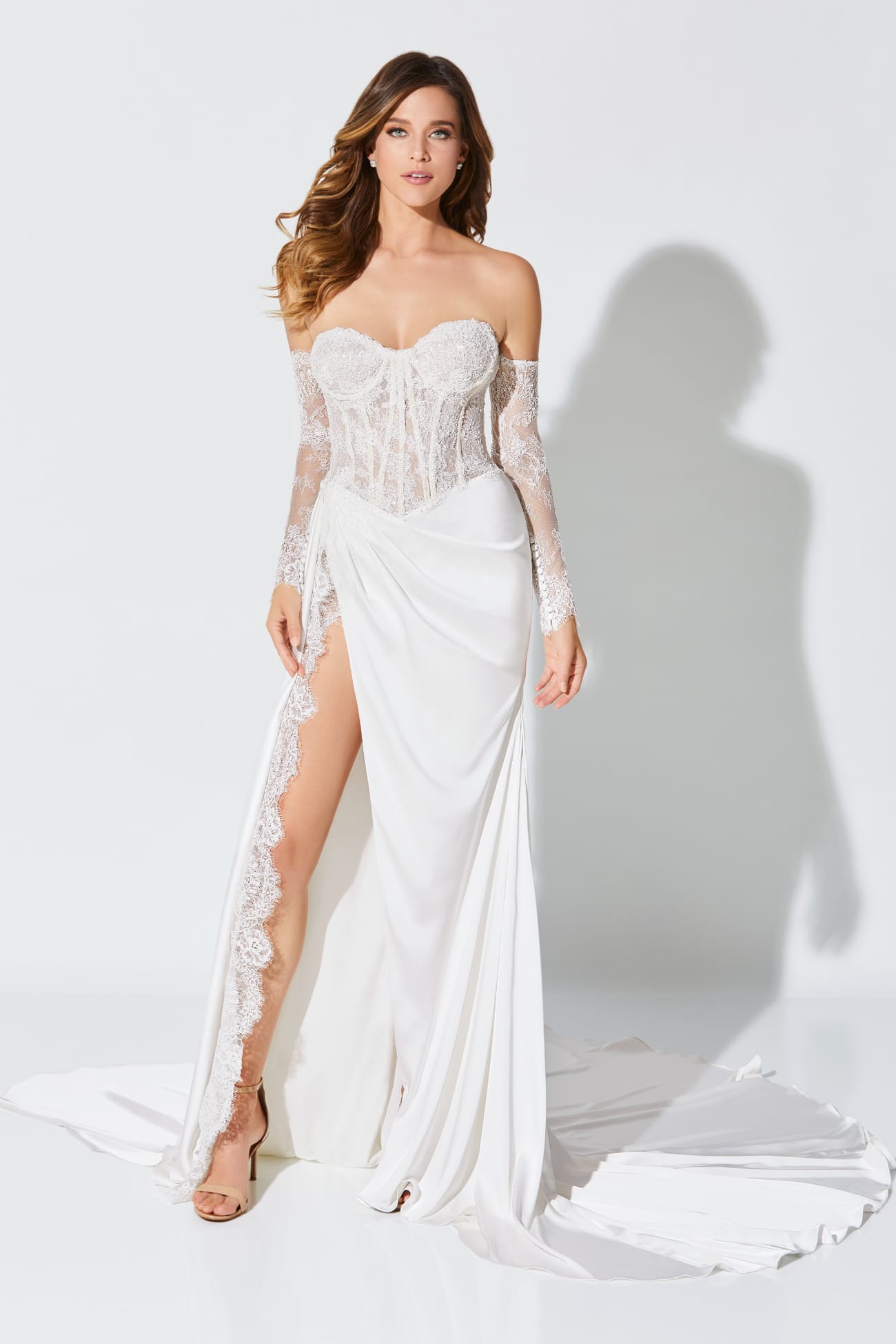 Capture everyone's attention in this sultry and seductive fit and flare gown. An ultra-flattering sweetheart neckline highlights your decolletage, while the softly structured semi-sheer bodice cinches your waist. A sexy thigh split with chantilly lace adds a gorgeously feminine edge to this stunning bridal look.