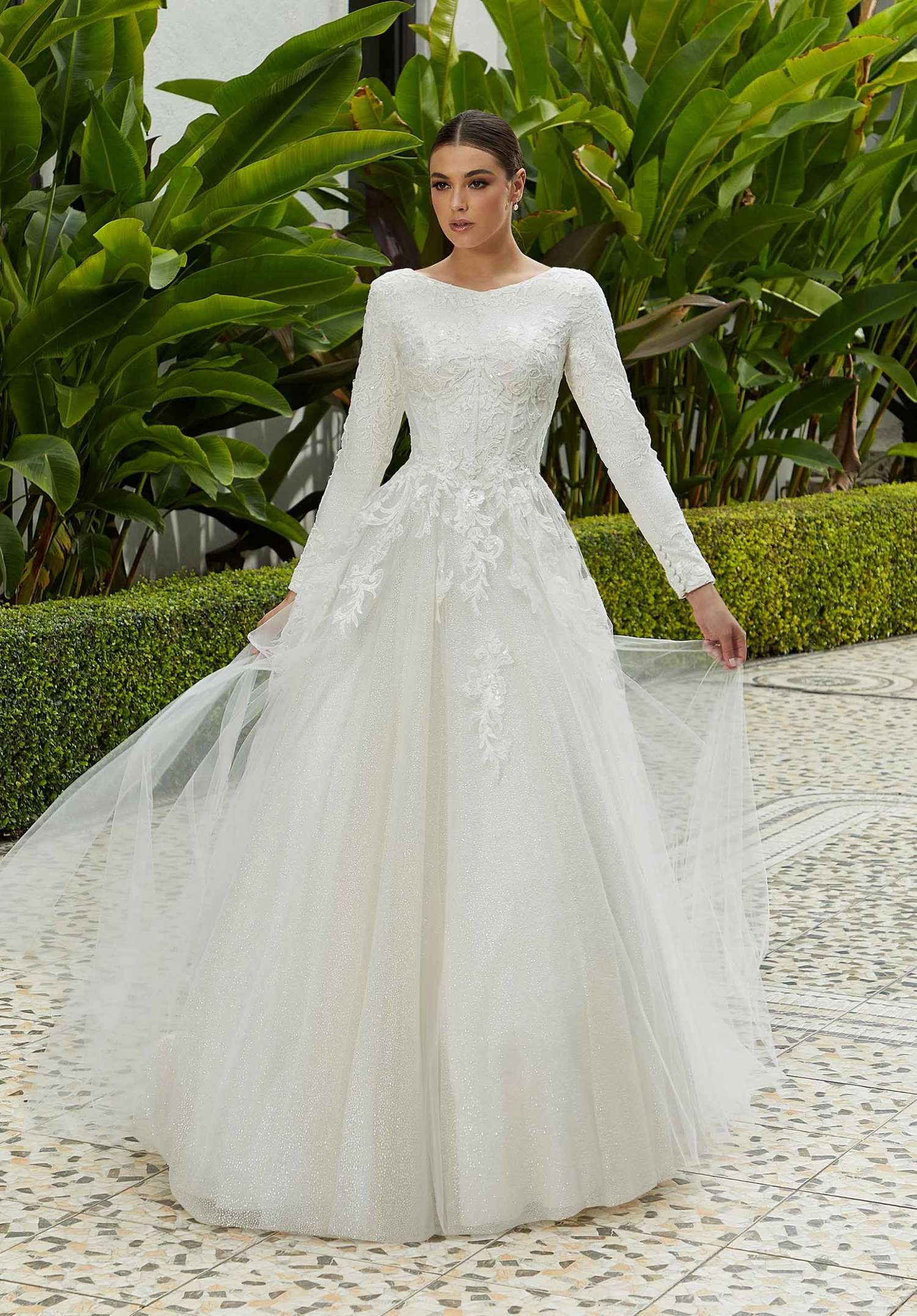 The A-line ball gown has a long sleeve bodice with wide v-neckline and sparkle tulle skirt.
