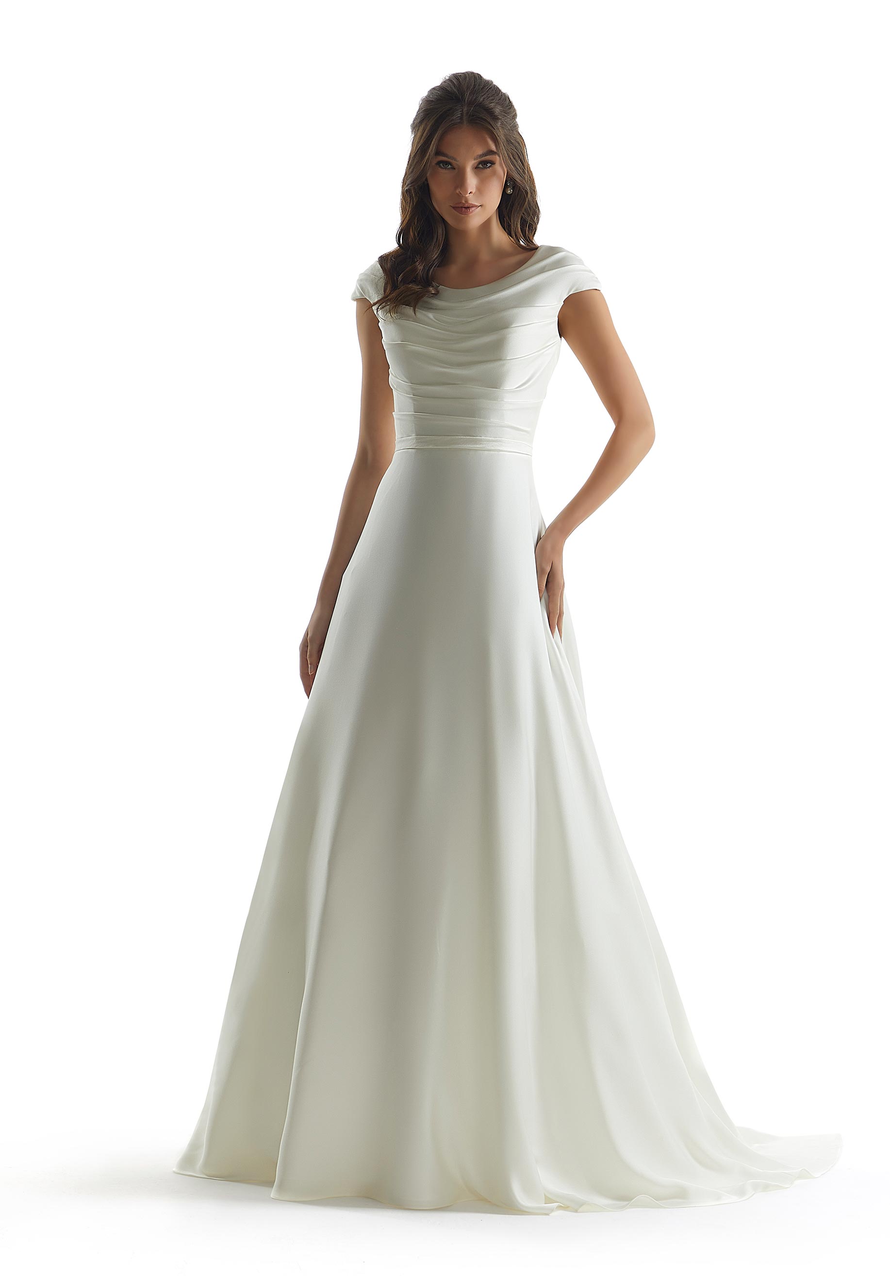 Our Norma designer wedding dress embraces sculptural style with an artfully draped bodice featuring a soft scoop neckline and delicate cap sleeves. The soft satin fabric has a radiant look and beautifully dances off the body for a flattering A-line shape. The tie-back sash is a feminine and dramatic addition to the classic gown. Shown in Ivory.