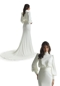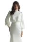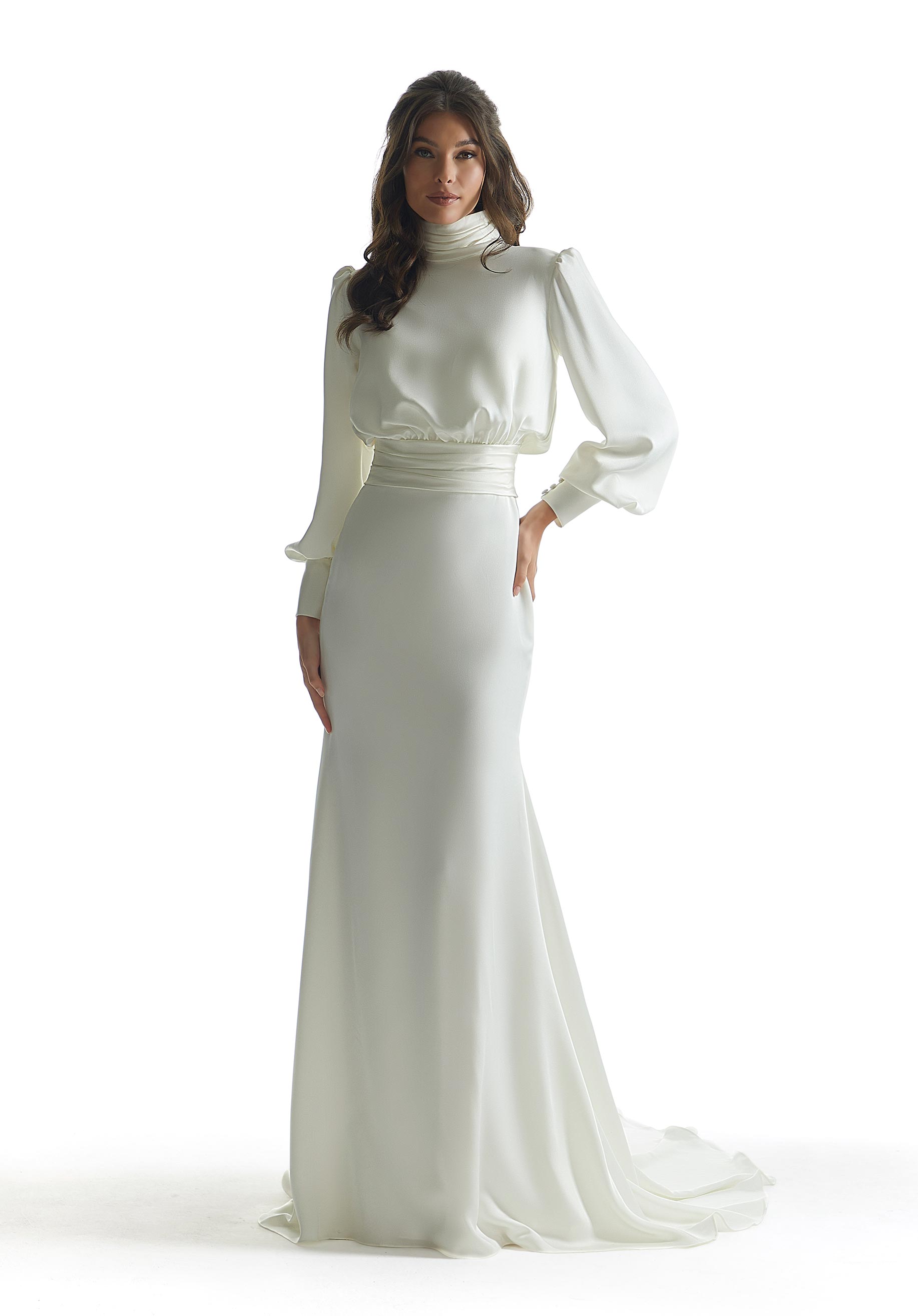 Inspired by vintage glamour our Nigella designer wedding dress features luminous soft stretch satin that has a fluid quality to it, dripping down the body like water. The high neckline and cuffed bishop sleeves feel both modest and high fashion with a draped waist detail to cinch you in and define your figure on the fit and flare silhouette.