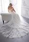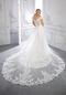 About Chandra: The Chantilly lace wedding dress, with net overskirt, features an off-the-shoulder v-neck bodice and sheer back.