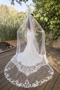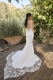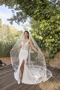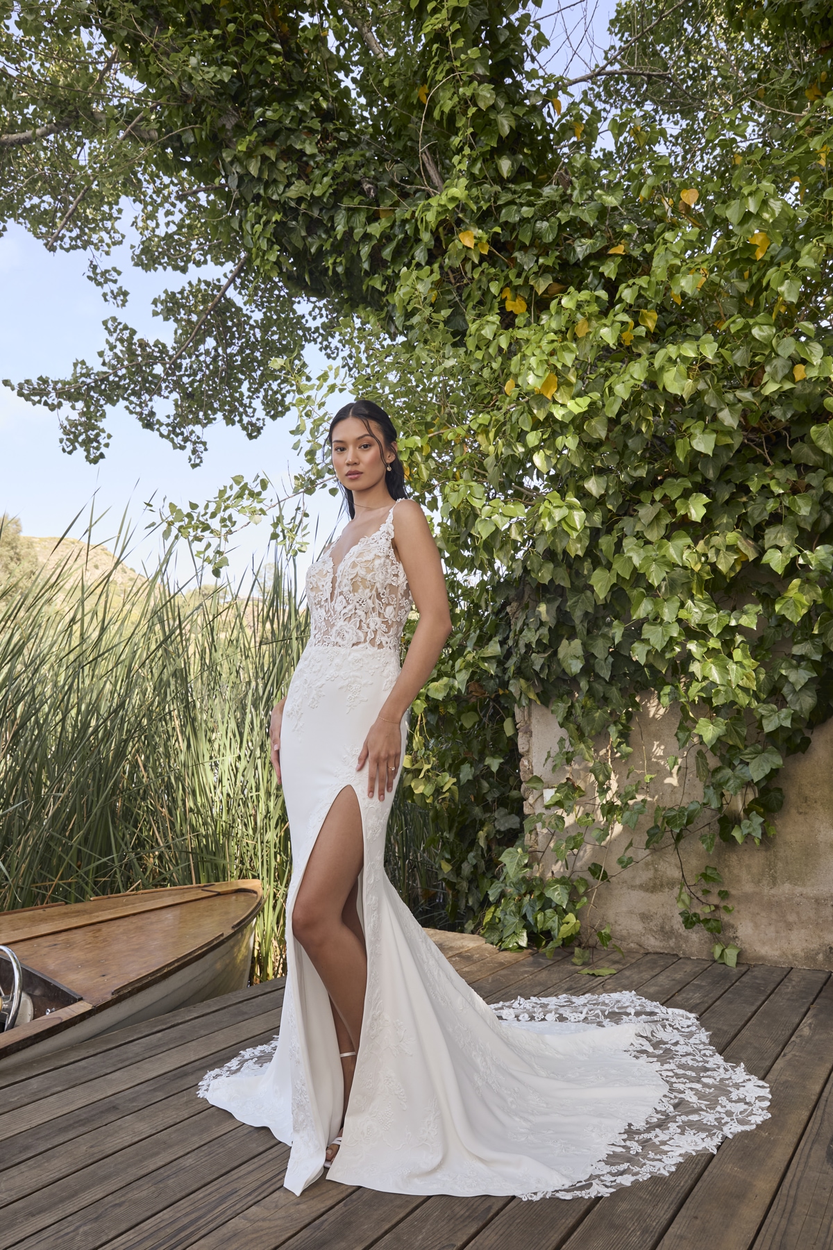 A soft breeze rustles through the reeds, blending with the distant calls of birds, while a groom whispers into his bride's ear words of sincere anticipation for their future. She stands on the dock like a vision of grace. Her hair laying in soft curls rests above the plunging V-neckline of her wedding gown, BL466 Ginny. The effortless beauty of 'Ginny' is reflected in every detail. Her unlined, 18-point boned bodice is decorated with sheer tulle and floral lace appliqués. Thin tank straps run over each shoulder and down her back into a low-cut, V-shape with a subtle zipper closure. The lace appliqués trickle down the top of the waist, overlaying a lined skirt crafted from stretch chiffon and stretch matte satin. These elegant details lead your eyes to a sultry thigh-high slit, allowing the breeze to flutter the skirt. Lace appliqués are thoughtfully placed around the slit and down to the 88-inch illusion train, adding subtle sparkle as the bride moves. The train is cut in a regal shape, culminating at a pointed tip to draw your eyes to the center of her cathedral veil, BL466V, offered separately. This gown can also be transformed into a 2-in-1 style by adding Ginny's romantic, illusion bishop sleeves. This is the ideal detachable accessory allowing brides to quickly transform their wedding day look from ceremony to reception.