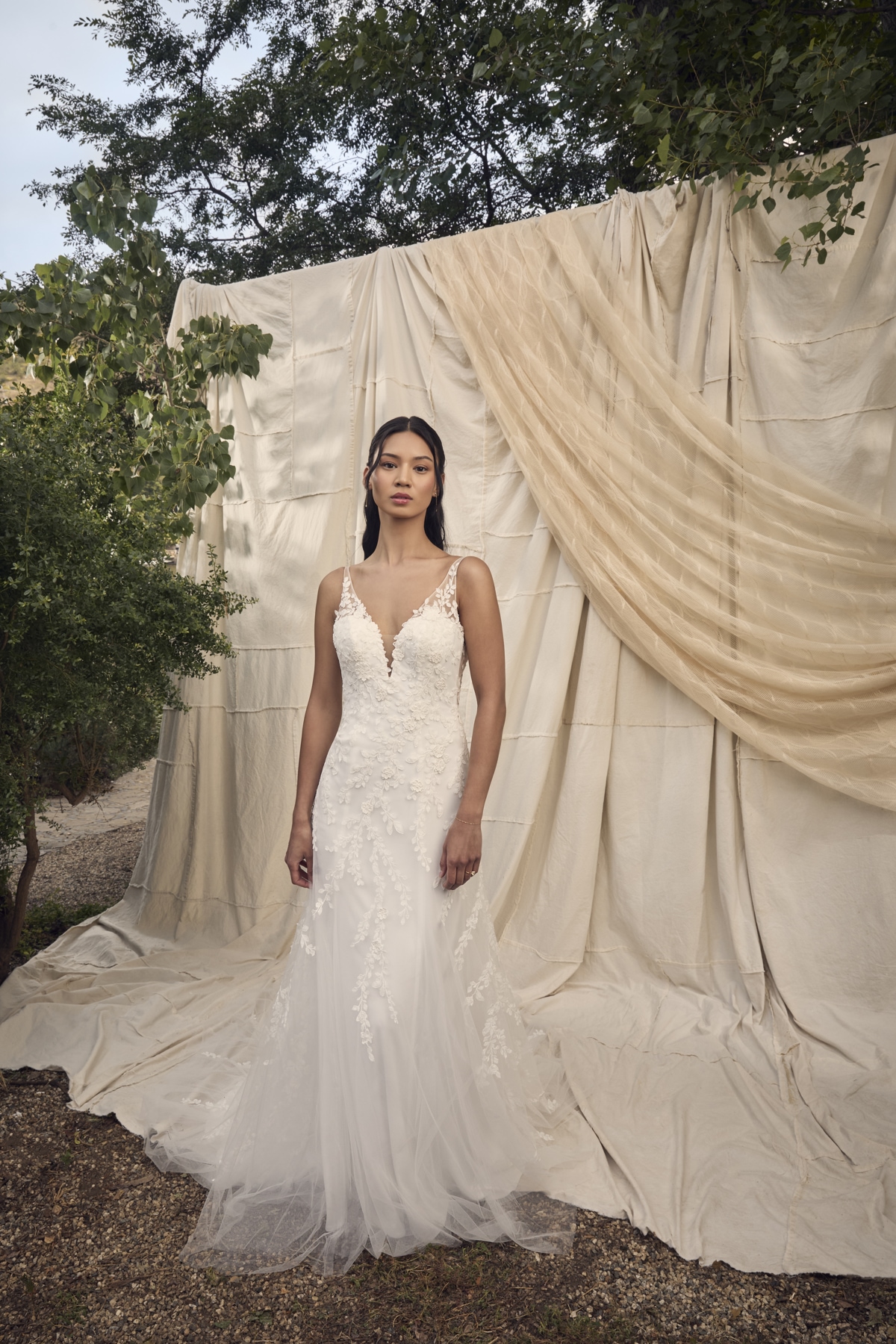 At the heart of this "Water's Edge" collection stands a gown that seeks to enchant with every detail, style BL467 Lyla. This sheath silhouette features a plunging V-neckline supported by lace tank straps and low-cut back. Her bodice is constructed with 10-point boning to highlight the bride's feminine curves. Crafted from stretch lining and tulle, this gown is decorated in 3D lace appliqués from top to hemline. Lyla's skirt sways elegantly with every step trailing an impressive 80-inch illusion train behind her. Complete this stunning ensemble with her sassy shoulder-length veil, style BL4467V, offered separately. Lyla invites peaceful contemplation before your wedding celebration.