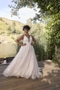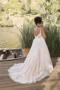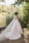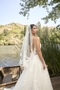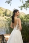 Ripples spread gently across the lake, creating a mesmerizing pattern mirroring the delicate lace details of BL472 Sawyer. This A-line wedding gown is light and airy, highlighting feminine beauty with her illusion, plunging V-neckline and back. Delicate spaghetti straps and 16-point boning in the bodice add lifted structure to this flattering silhouette. 'Sawyer' features unique illusion side panels in the consistent V-shape. This creates subtle body contouring in the bodice. Crafted from lining and tulle, 'Sawyer' is decorated top to hemline with botanical lace appliqués. This gown beautifully draws on her surroundings to present a nature inspired ensemble. In the back of the gown, her low V-cut draws your eyes downward to her cascading 72-inch train. 'Sawyer's' train lays softly behind her like lily pads floating gently at the water's edge. For an extra whimsical pairing, 'Sawyer' was designed with a tulle cape offered separately, CP027. This can be easily added by clipping on her large floral choker collar. CP027 truly captures the bride's beautiful face and can create an elevated look when paired with an updo and gold accessories. 'Sawyer's' fingertip veil, BL472V, is also offered separately.