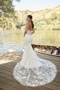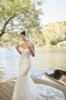 The gentle sounds of trees swaying at the water's edge blend into a harmonious sense of tranquility. A blushing bride wearing BL474 Cedar embraces the moment with a strapless, fit-and-flare silhouette. Her sweetheart neckline highlights an exposed, sheer Basque waist bodice. 13-point boning can be seen from every angle peeking through artfully placed lace appliqués. 'Cedar' is crafted from stretch lining and tulle with lace appliqués decorating her entire ensemble. Her best angle is when the bride looks over her shoulder, drawing attention to her 78-inch illusion train. A knee length veil with a matching lace design completes this bridal look, BL474V, offered separately.