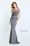A figure flattering crepe gown with a tulle illusion sweetheart neckline, beaded bodice, peplum waistline, short sleeves, and a sweep train.