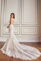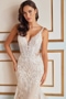 Wow your wedding party in this mesmerizing mermaid gown, crafted from sparkling glitter tulle and dreamy organza. Its flattering v-neckline elegantly highlights the decolletage, while semi-sheer illusion panels on the bodice accentuate the waist. A breathtaking cathedral train adorned in delicate lace applique completes this stunning bridal style.