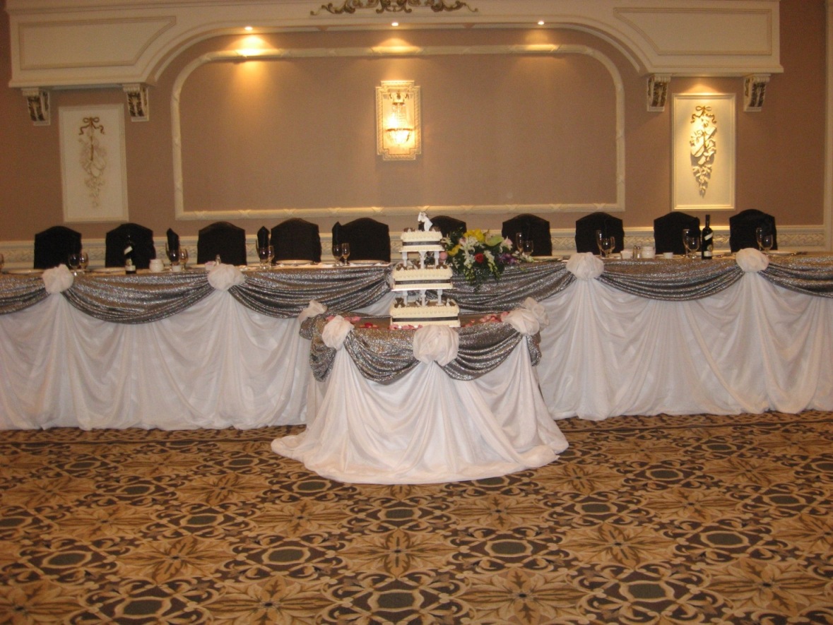 1 Head table for 8-12 people and Cake table drapery with 2 colors of fabric. Different colors of fabric are available.