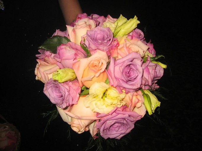 10 peach roses, 10 light purple roses, 5 lisianthus in a round hand tied bouquet. Available in different colors.