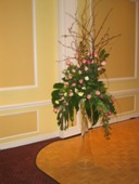 An exquisite arrangement of 35 roses in a cascade, seamlessly interspersed with 12 tulips, 10 stems white and peppered with lime green lisianthus, set on a foundation of green berries, brunches and the ever present greenery. As with all the other arrangements, you can match the colors of the flowers with you own special motif, or just get your favorite color. These are good for empty corners or as decorations for your entrance - best to be seen, but not in the way. The triangular base will give it enough stability, but will probably not stand for overly heavy traffic.