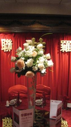 All 15 roses, 5 hydrangeas, 5 orchids and greenery of this centerpiece seem to be springing towards the sky in gleeful celebration, almost like a champagne bottle being popped to announce that the party is about to begin. You can choose different colors, but white and pink give it that frothy look and will go with any color motif that you already have. The greenery will provide enough contrast so that it will not look too bland and lifeless. The thin stem leaves more space on the table for menus, programs and memorabilia that you want to give to your guests.