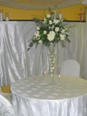 A tall, delightfully cone-shaped vase with 4 white hydrangeas, 3 white snap dragons, 7 white orchids, 10 white roses and interspersed with greenery with delicate leaves spraying out gently. You can get additional flowers to make the arrangement a little more substantial, or leave it as it is for a most wistful ambiance. For additional touches of sweet melancholy, add in a few tea lights, and sprinkle some rose petals on the table. This will give the occasion as soft touch with a subtle flare. It will also go with any color motif and most venue decor that you have.