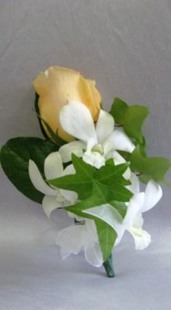 1 yellow rose, 3 white orchids , white ribbon, and greenery. Available in different colors.